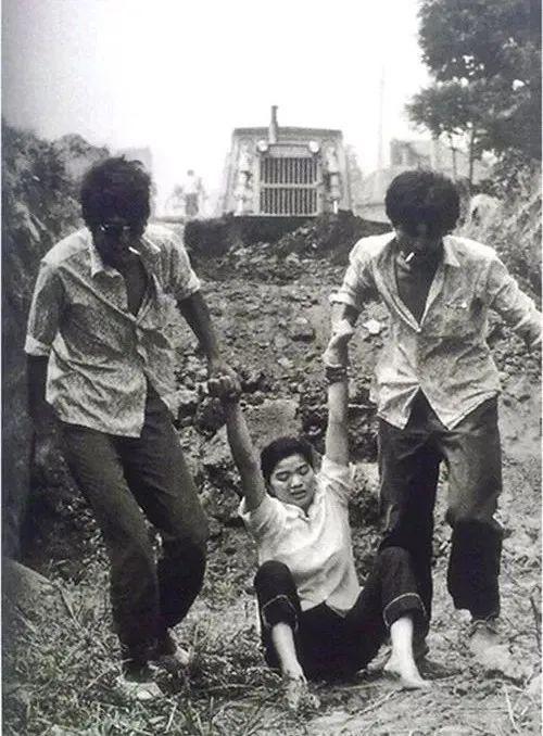 他们的背后是正在前行的推土机。